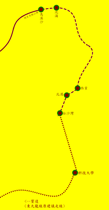 停靠車站如下:馬鞍山站--鳥溪沙站--泥涌站--西貢站--北港站--白沙灣站--科技大學站--(原有的東九龍線建議走線前往鑽石山)