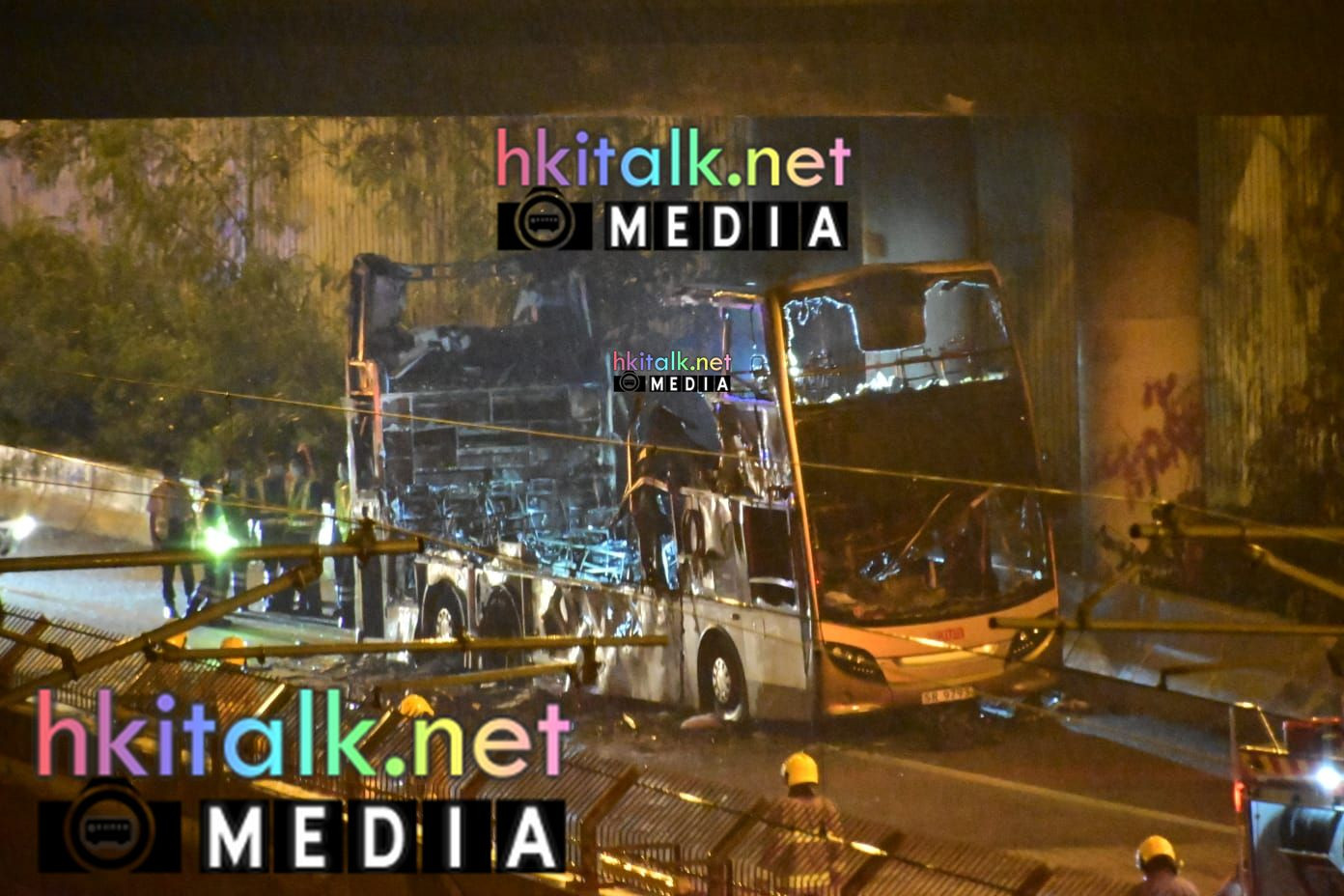 九巴 ATENU280 (SR9793) 行走 673 往上水時在大老山公路近石門起火後近一小時,消防員已完成撲救程序,全車焚毀,幾乎只燒剩頭尾幅。