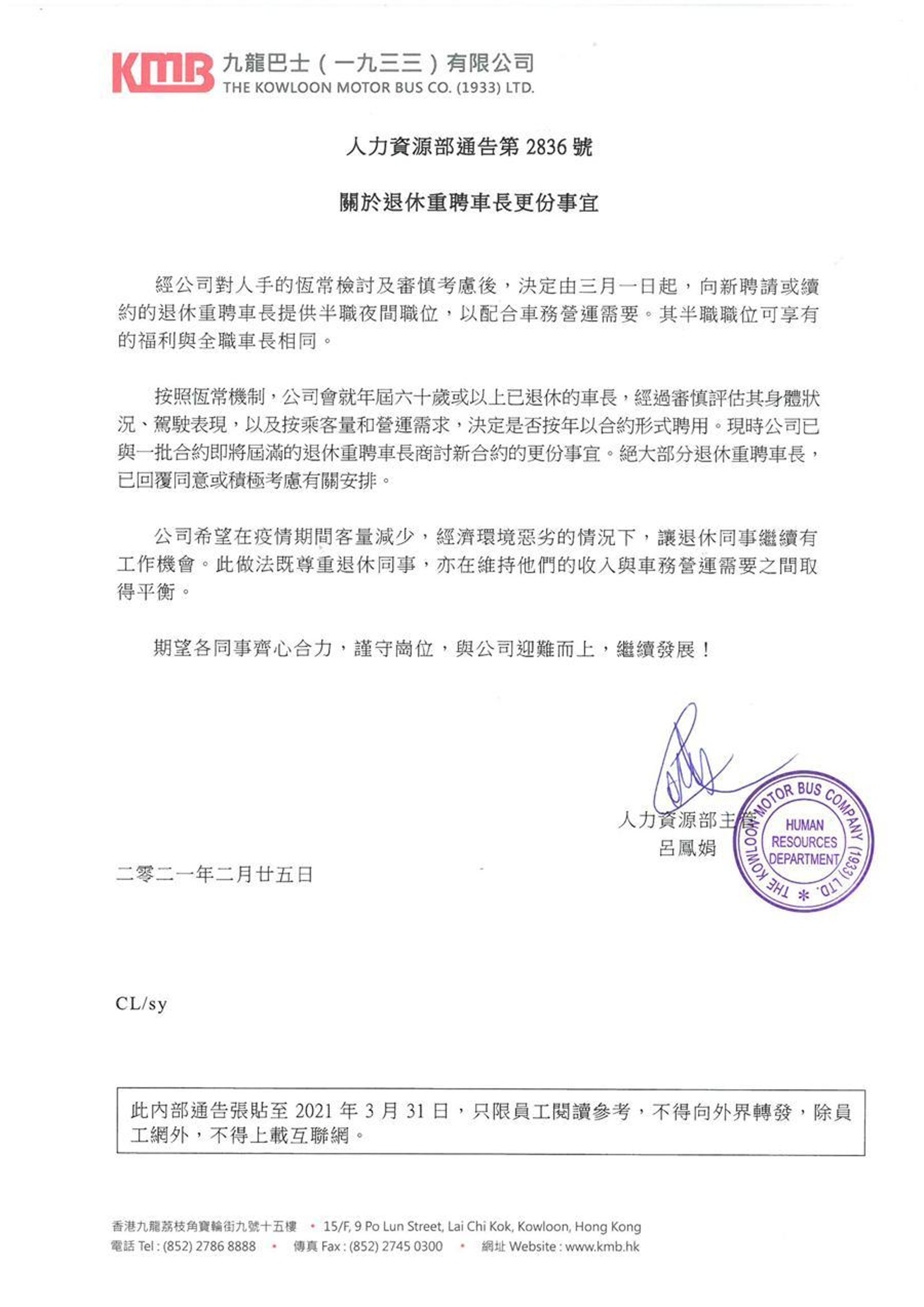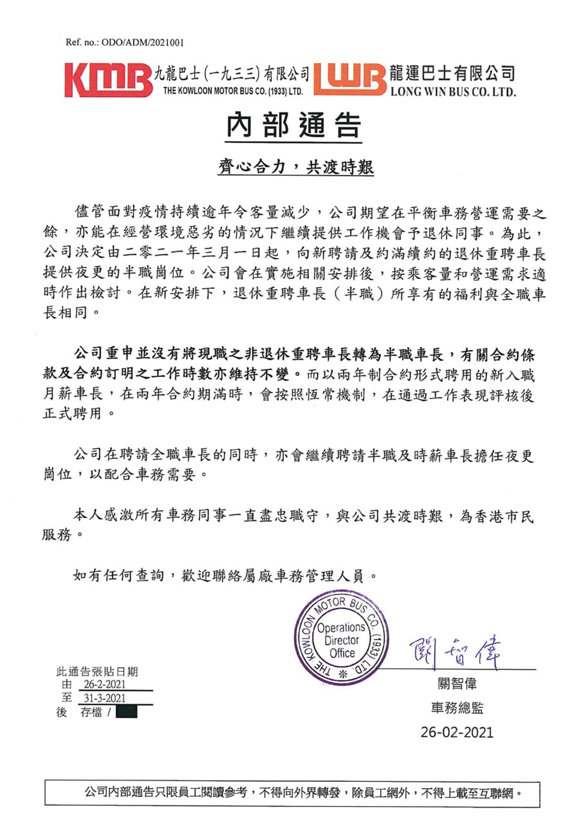 HK01報道九巴給員工通告
