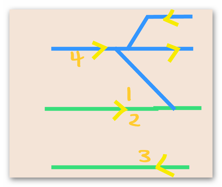 如果是這樣的話,興建東九龍綫後,地鐵鑽石山站的路軌將會是這圖(不按比例繪畫)- 注:綠色為觀塘綫部分,藍色為東九龍綫部分,鑽石山上行(往調景嶺方向)會開兩邊門