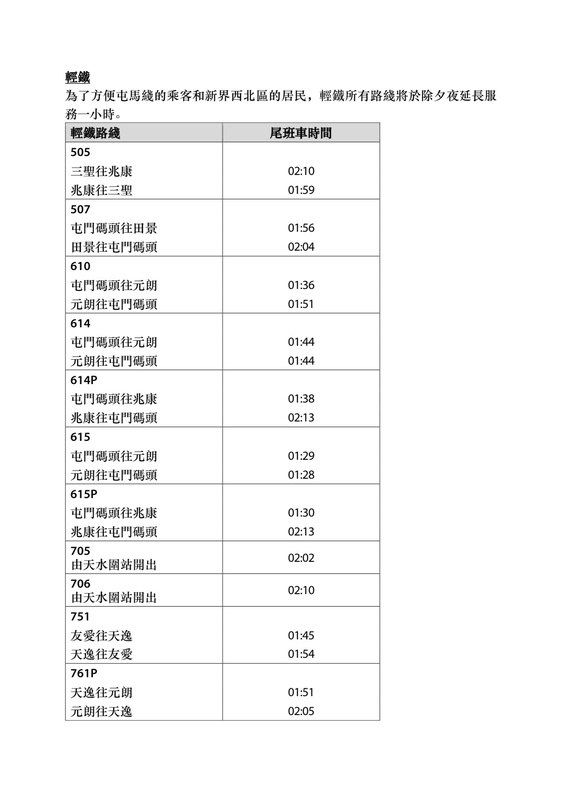 - 31/12(除夕夜)延長尾車時間1小時(包括輕鐵,但不包括迪士尼綫及機場快綫)