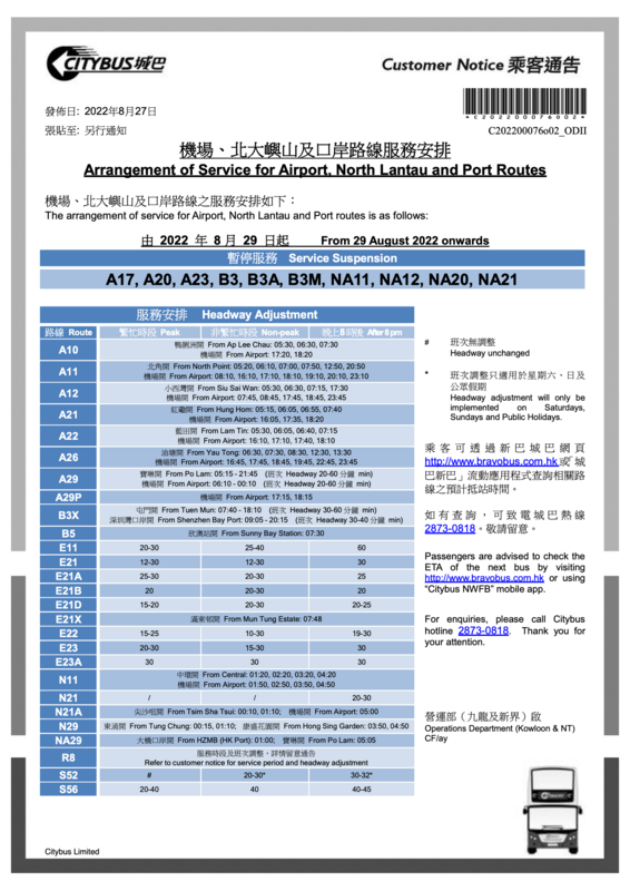 新城機場、北大嶼、口岸線減班表(29/8 起)
