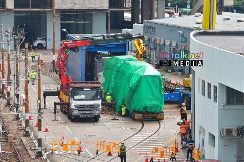 退役第二期輕鐵列車1075、1208,今早被吊上貨車準備運往劏車場。