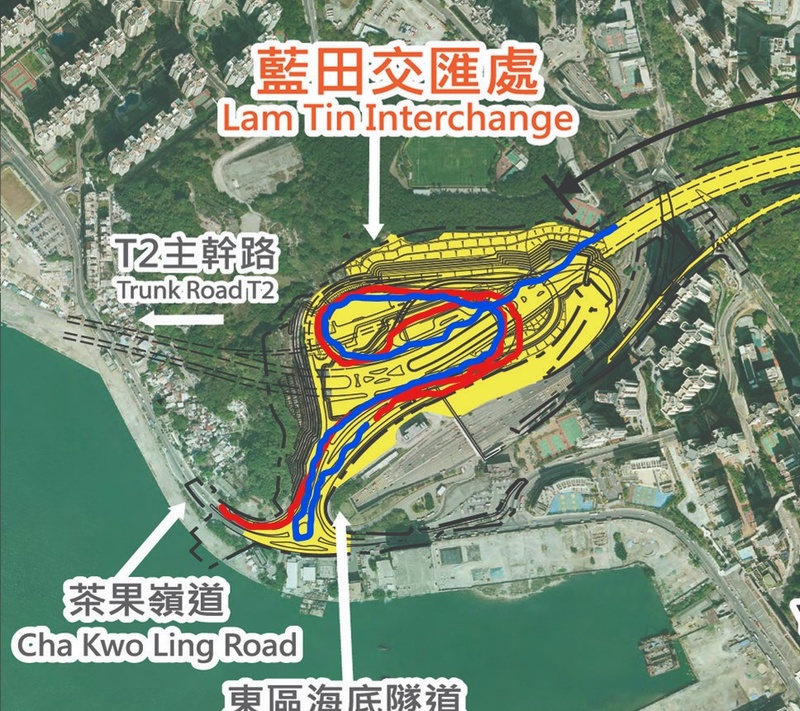 紅線:茶果嶺道往轉車站;藍線:轉車站往將軍澳—藍田隧道