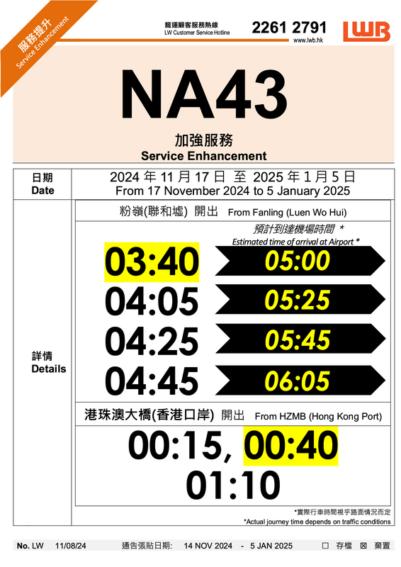 龍運NA40、NA41、NA43 加班