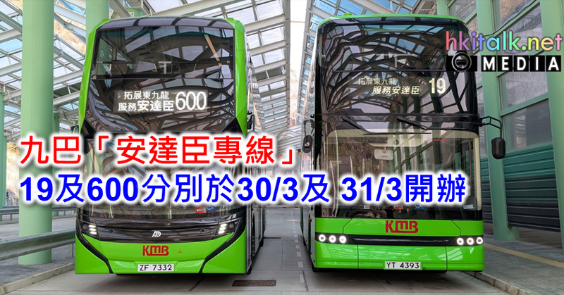九龍巴士(一九三三)有限公司(「九巴」)自2016年開始服務安達臣道發展區,為安達、安泰居民出行提供優質巴士服務,更於去年再下一城,獲選為營辦安達臣道石礦場發展區四條新路線的巴士公司。為迎接安愉道首個居屋項目安秀苑入伙,九巴欣然宣布,兩條全新「安達臣專線」,路線19 [安達臣(安愉道)– 鑽石山(循環線)] 及路線600 [安達臣(安愉道) ⇌ 中環(林士街)],將分別於3月30日(星期日)及3月31日(星期一)起投入服務,配合區內四通八達的轉乘優惠,進一步提升九巴東九龍的巴士網絡。 路線19和路線600主力以零排放電巴行駛,成為九巴在區內推行綠色運輸的新里程。 路線19 全日接駁彩虹鑽石山 享轉乘優惠覆蓋全港 由3月30日(星期日)起,路線19 [安達臣(安愉道)– 鑽石山(循環線)] 全日接駁安達臣及鑽石山,途經安秀苑、安泰巴士總站、白虹樓、牛池灣轉車站-彩虹站及紅萼樓、鑽石山啟翔苑。居民乘坐路線19可以在牛池灣轉車站,轉乘超過50條九巴路線往返九龍巿區、沙田、大埔、北區、元朗及屯門等地方,第二程車最高更可享$4.2的轉乘優惠。 路線19服務時間由早上5時30分至午夜12時30分,全天候接駁安達臣及九巴巴士網絡,方便前往港九新界各區。 路線資料︰ 路線 | 服務時間 | 主要途經地點 | 全程車費 | 19