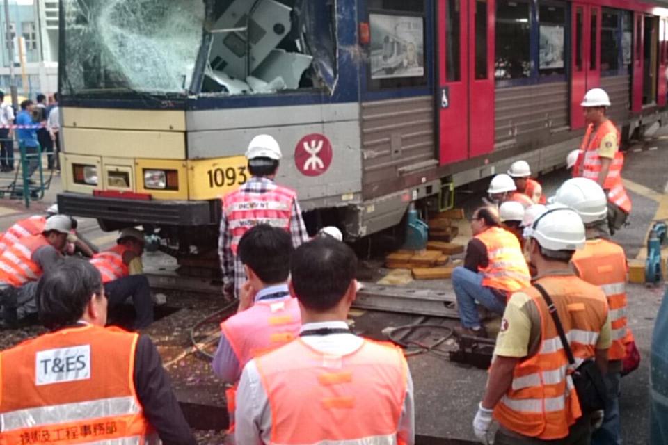 [輕鐵與巴士相撞意外即時相片]工程人員正準備移正出軌列車